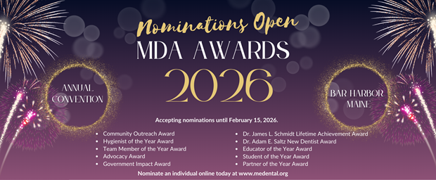 To submit a nominations, you may use the "Nomination Form" listed under each individual award's descriptor, or you may send your nominations to MDA Executive Director Therese Cahill at tcahill@medental.org. Nominations should be submitted in 250 words or less. Nominations are open until February 15.